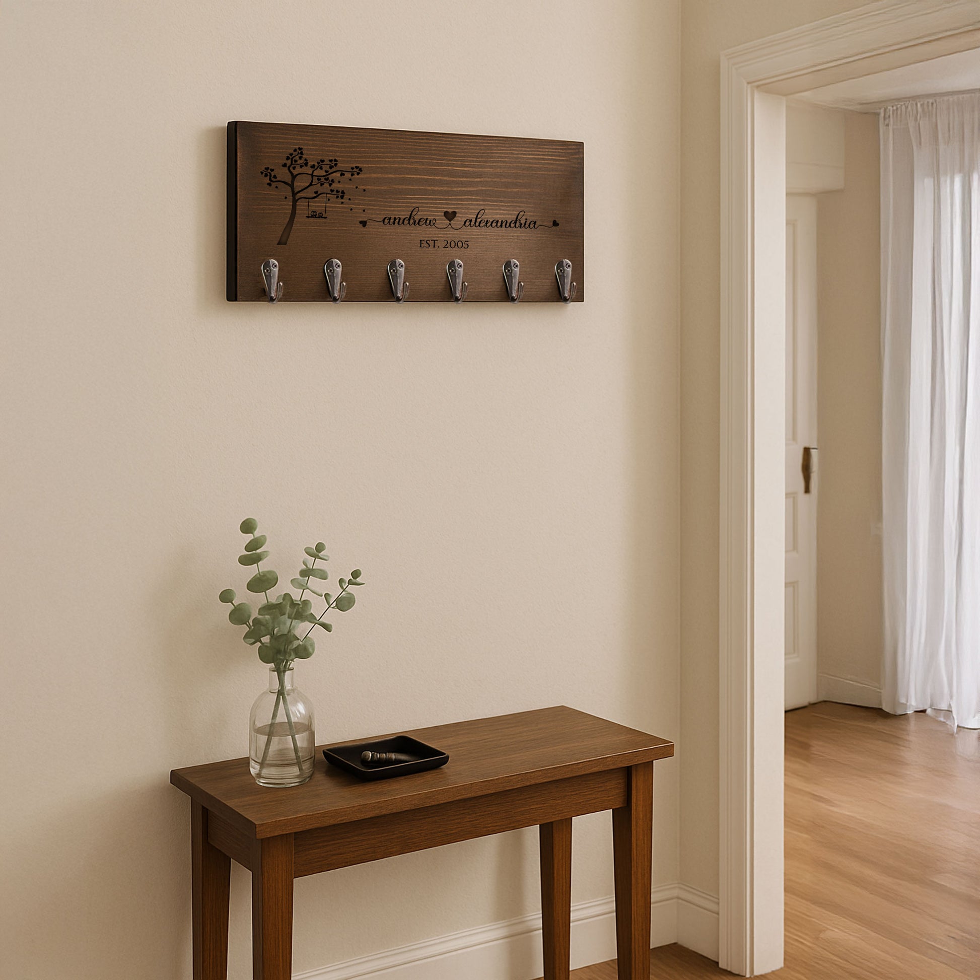 Add a personal touch to your home’s entryway with this Personalized Wooden Key Hanger, thoughtfully crafted from premium walnut wood. This beautifully finished plaque features sleek metal hooks to keep your keys, fobs, or small accessories organized and within easy reach. The standout feature is the custom engraving on the wood—perfect for showcasing a family name, special date, or meaningful phrase, making it both functional and decorative.